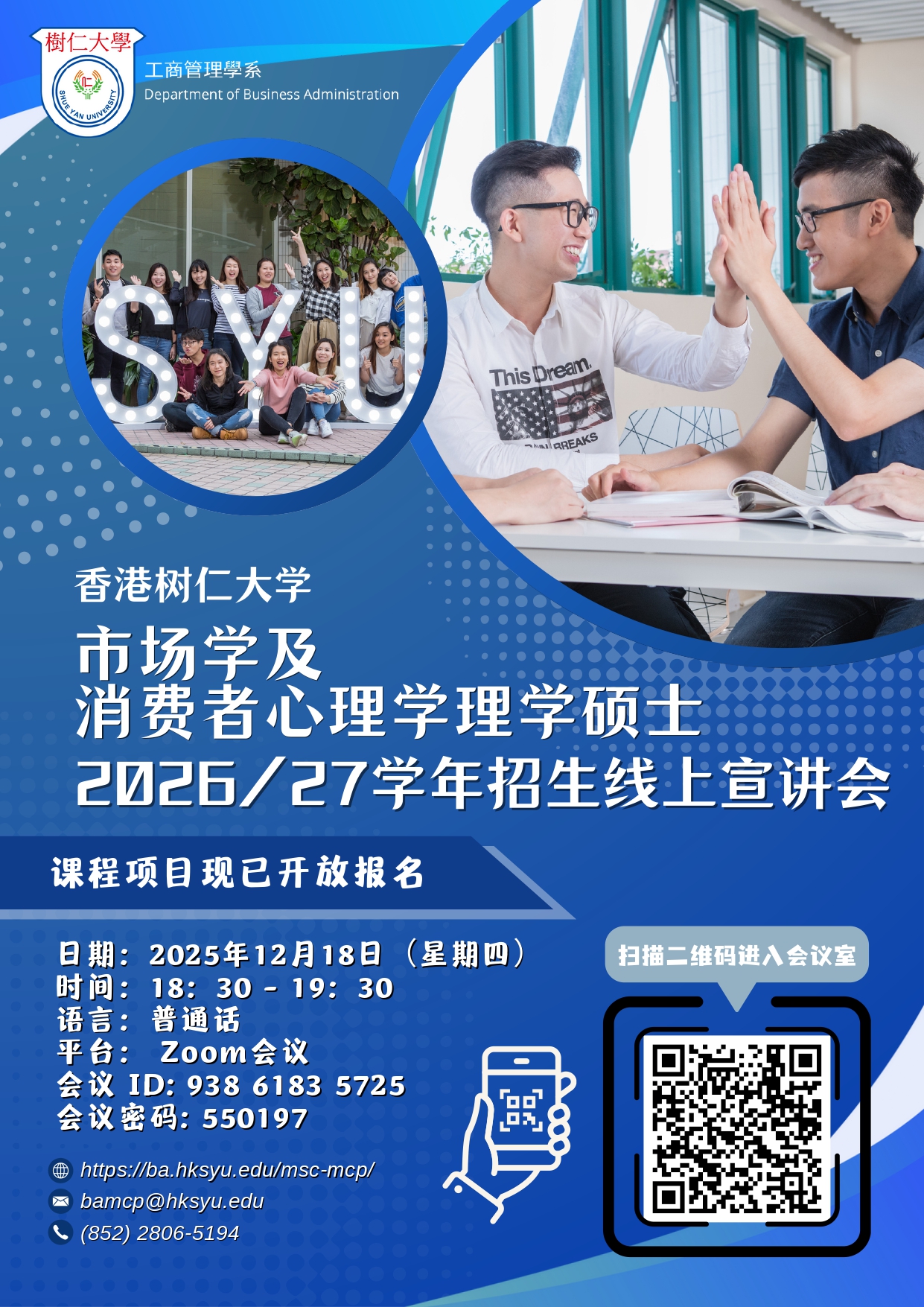 - 若申请人有任何关于申请系统、申请材料、入学录取等方面问题,敬请通过电邮 pgadmit@hksyu.edu 联络大学招生处查询; 若有任何课程信息或设置等方面问题,敬请通过电邮 bamcp@hksyu.edu 联系课程组查询。