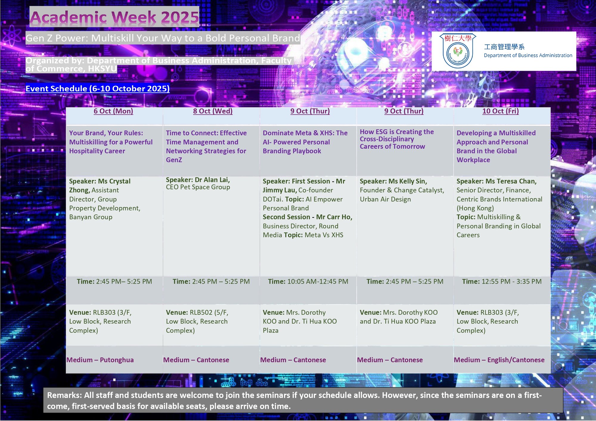 The Department of Business Administration (BA Department), Faculty of Commerce at HKSYU, proudly hosted its annual “Academic Week (AWeek)” every October. Academic Week 2025, themed "Gen Z Power: Multiskill Your Way to a Bold Personal Brand" was a successful event held from 6 to 10 October 2025. The event included a series of guest speakers who offered valuable insights on developing a strong personal brand and adapting to the evolving global workplace.